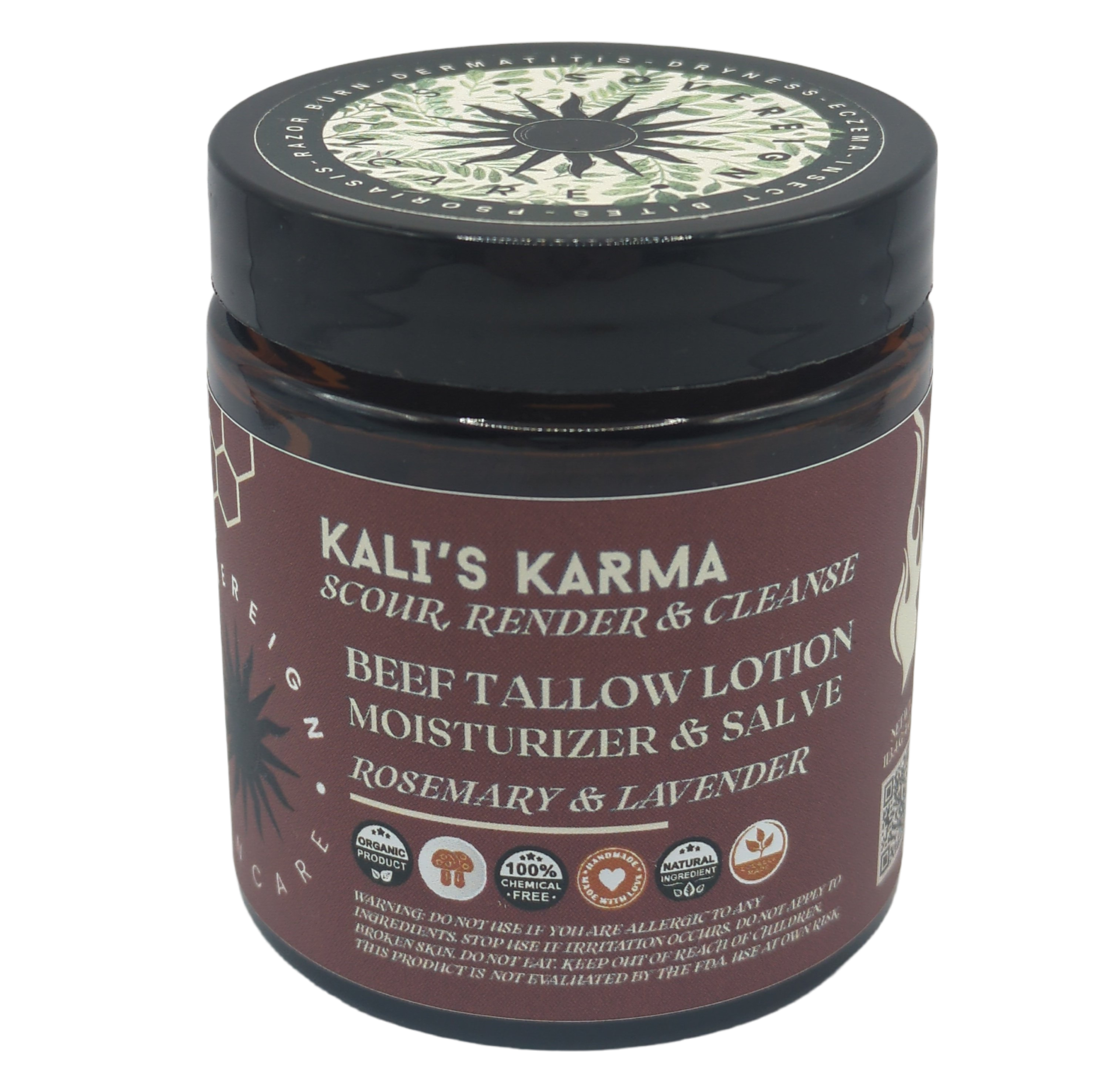 Experience the transformative power of Kali’s Karma, a potent tallow salve designed to renew your skin. This formidable blend of chaga mushroom, soursop, rosemary and castor oil detoxifies, promotes circulation, and encourages cellular regeneration. It helps you release the old to reveal a revitalized complexion, embracing the profound renewal that follows.