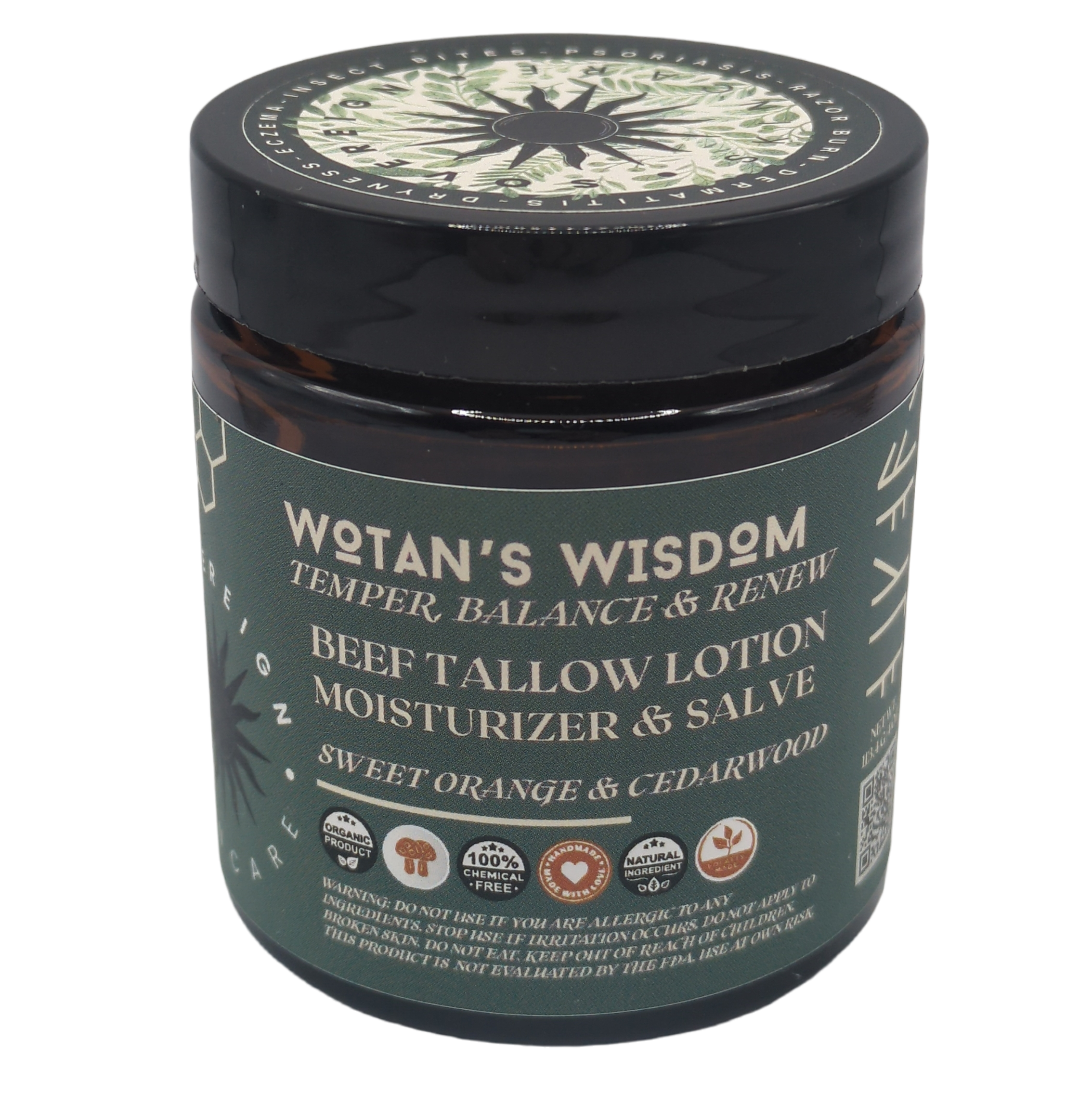 Wield the ancient strength of Wotan’s Wisdom, a restorative tallow salve. This blend of nutrient-dense tallow, lion’s mane, comfrey, and plantain calms irritation, accelerates healing, and fortifies your skin’s natural barrier. The result is a healed, resilient, and profoundly wise complexion.